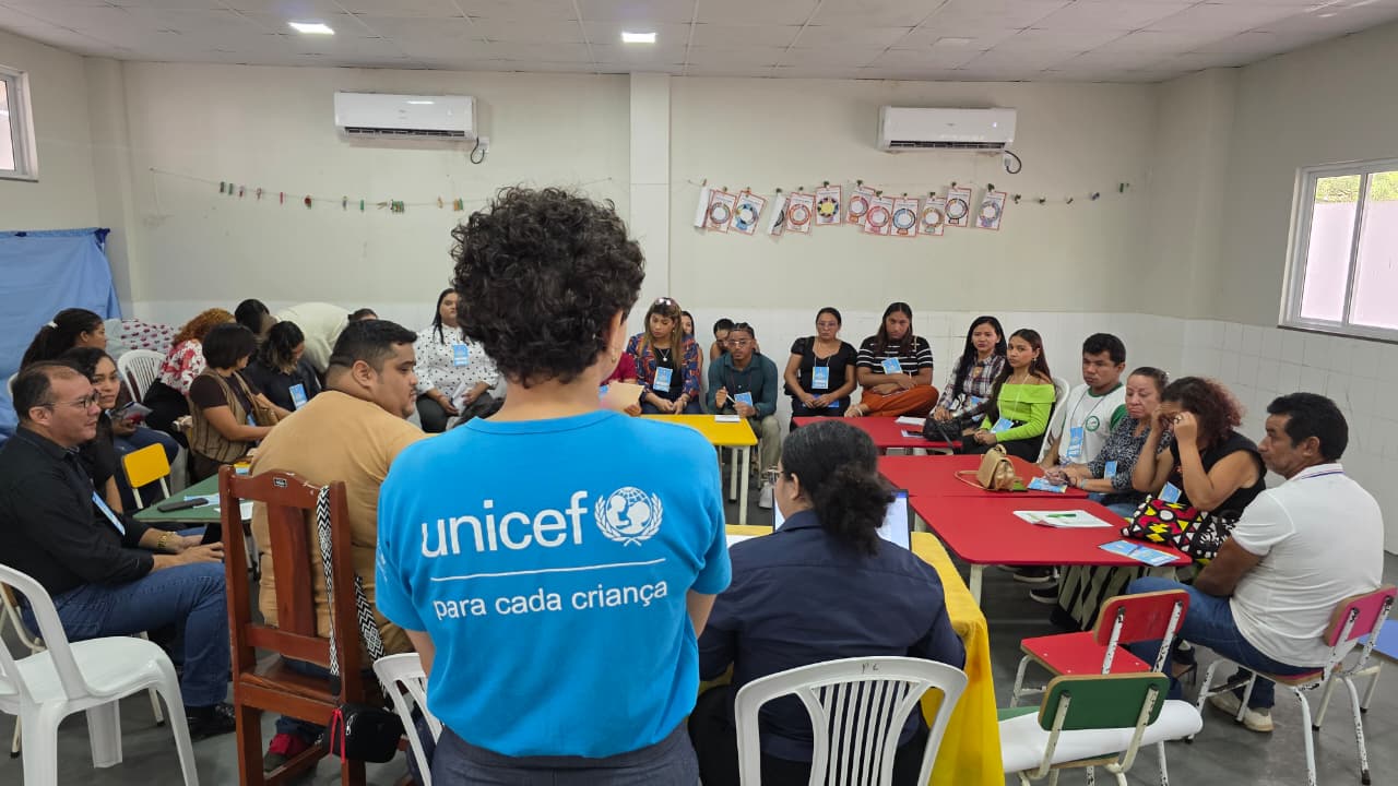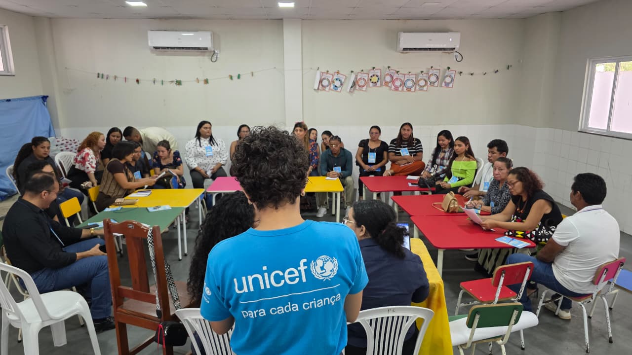 No Centro de Educação Infantil O Pequeno Príncipe, os participantes se dividiram em salas temáticas para discutir os seis Resultados Sistêmicos do Unicef: Saúde e Nutrição; Educação; Proteção contra as Violências; Água, Saneamento, Higiene e Resiliência Climática; Proteção Social; e Equidade Étnico-Racial.