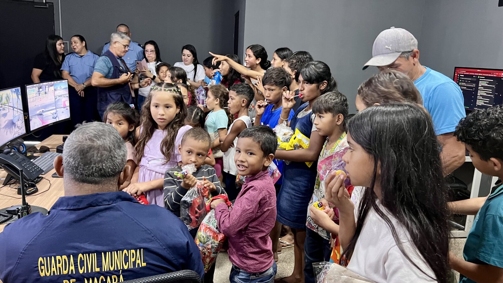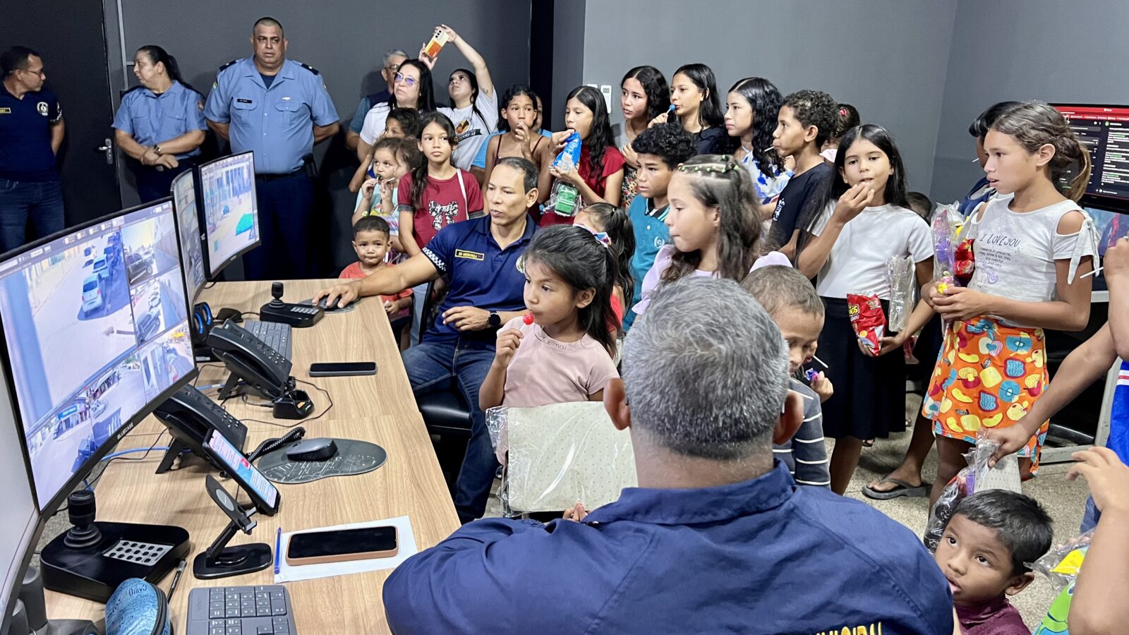 Os participantes também visitaram o Centro de Controle Operacional (CCO), onde puderam conhecer o sistema de videomonitoramento dos totens espalhados pela cidade. A experiência despertou o interesse dos pequenos pela tecnologia e pelo trabalho de vigilância urbana.