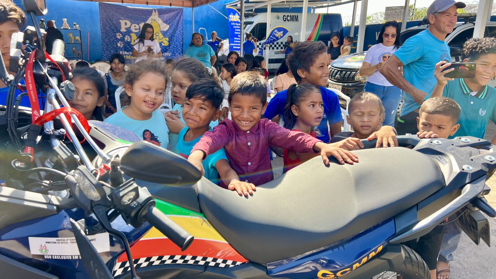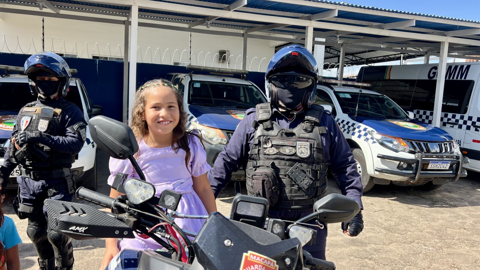 Em continuidade às apresentações, o Grupo Tático de Ações Motorizadas (GTAM) realizou uma simulação de abordagem com motos, despertando a curiosidade e o entusiasmo das crianças.