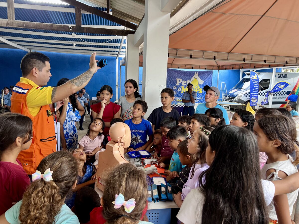 Além disso, os agentes ofereceram orientações básicas de primeiros socorros, ensinando como agir em situações de emergência. Outro destaque foram os cães do canil da guarda, que encantaram os pequenos com demonstrações de obediência e habilidades operacionais.
