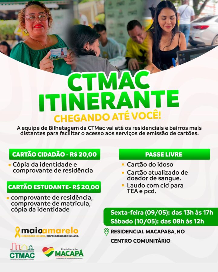 A Companhia de Trânsito e Transporte de Macapá (CTMac) iniciou o programa Bilhetagem Itinerante, que facilita o acesso da população aos serviços de solicitação e cadastramento dos cartões utilizados nos coletivos urbanos. A ação atenderá diversos bairros e conjuntos habitacionais da cidade. Nesta sexta-feira (9) e sábado (10), o atendimento aconteceu no Centro Comunitário do Conjunto Macapaba.