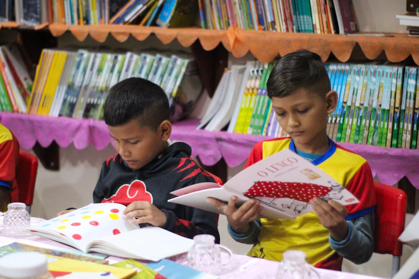 Os alunos do 4º ano, Morana Nascimento e Marlon Daniel, ambos com 9 anos, são leitores fluentes e adoram participar do projeto. Segundo eles, os encontros semanais na biblioteca despertaram o gosto pela leitura. Morana estava empolgada com a leitura do livro A Bola do Vizinho, da escritora Raquel Matsushita.