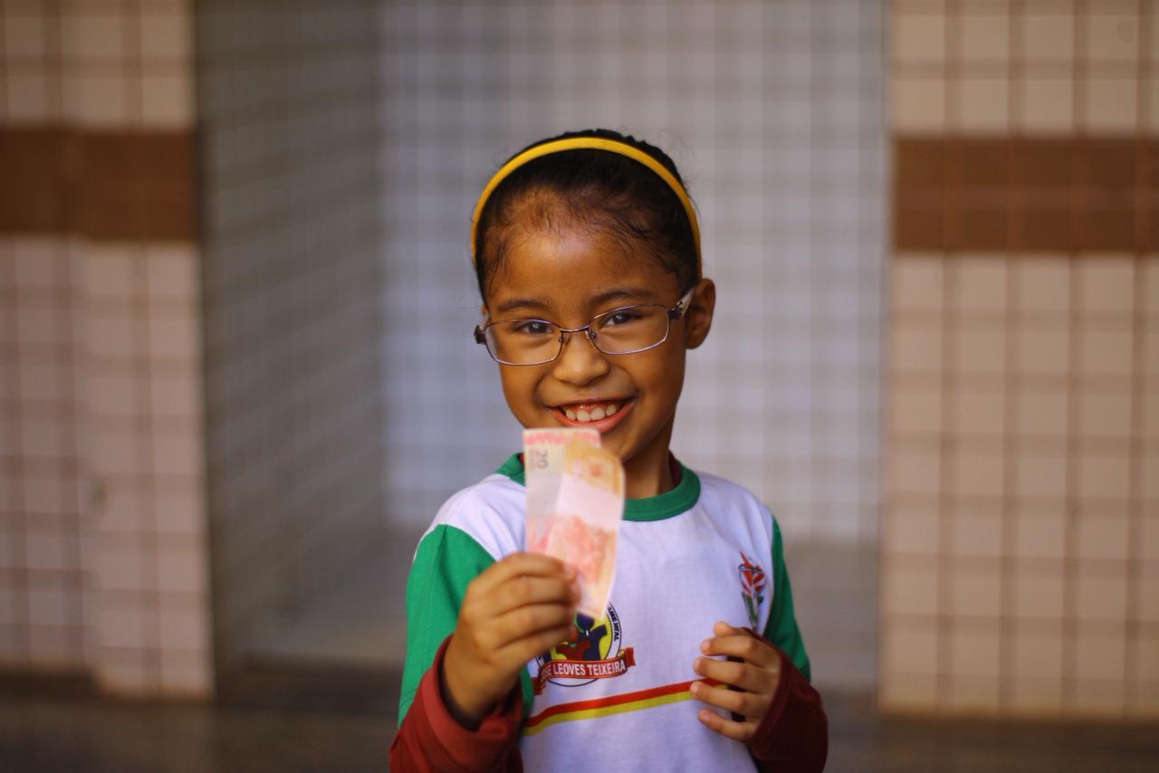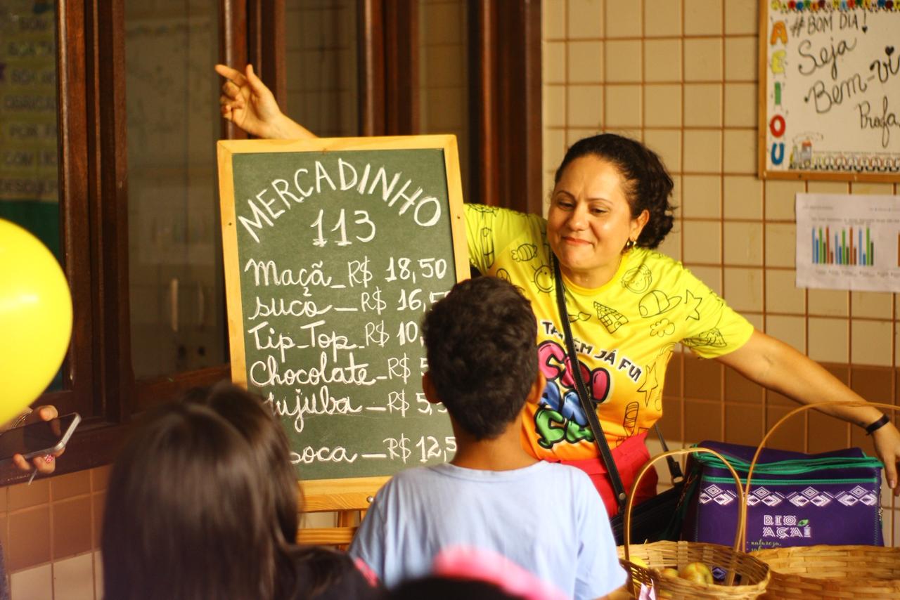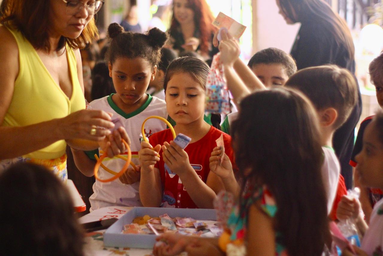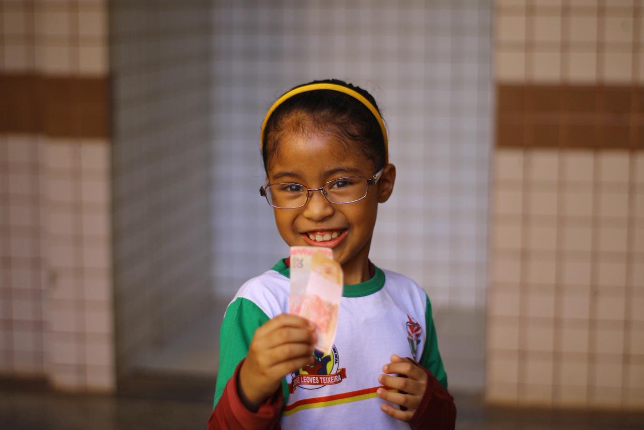 A aluna Elisa Gabryelle, de 7 anos, mostrou entusiasmo ao participar da atividade. “Eu estava com 50 reais. Comprei essa tiara linda e ainda fiquei com 40 reais, que vou economizar”, contou, orgulhosa do próprio raciocínio matemático.