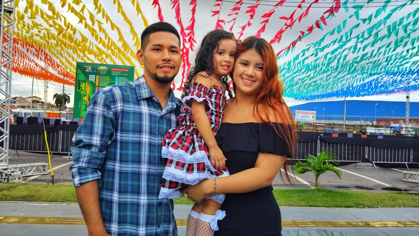 Os jovens pais da pequena Zoe Helena, o encanador Yan Santana, de 24 anos, e a autônoma Jennifer Silva, 20 anos, falaram da emoção em trazer a filha, que estuda Creche Tia Raimunda, para a sua primeira quadrilha junina.