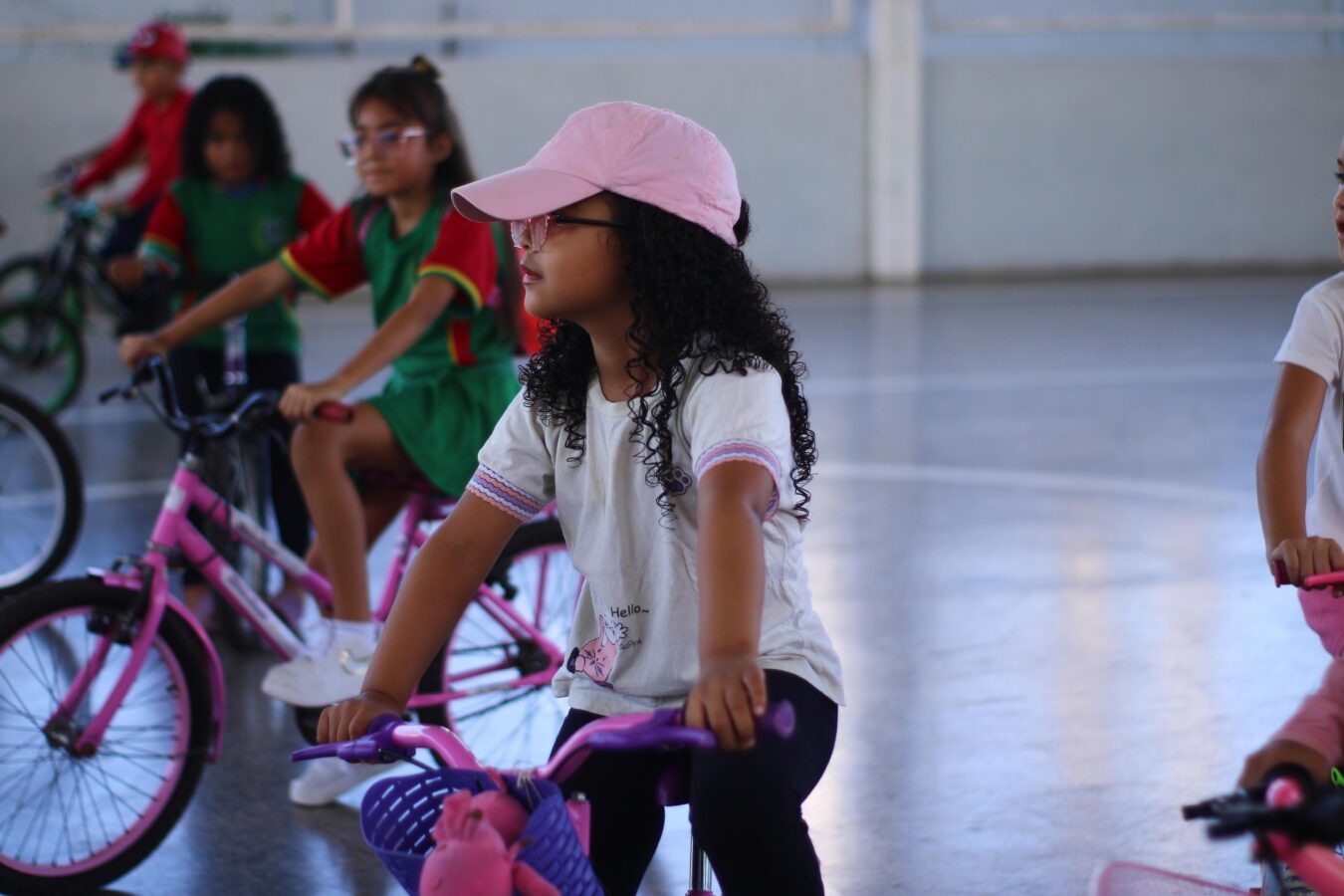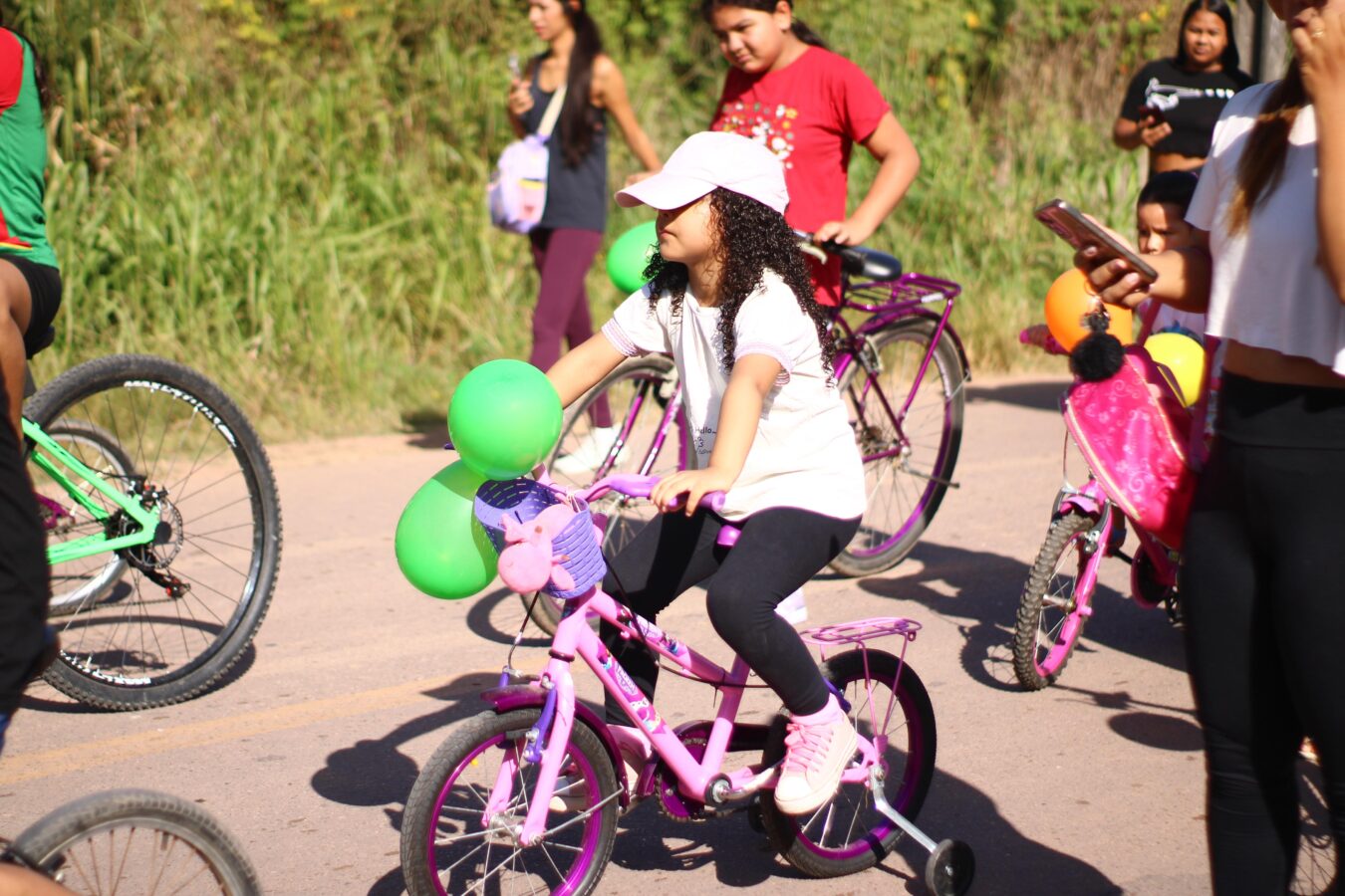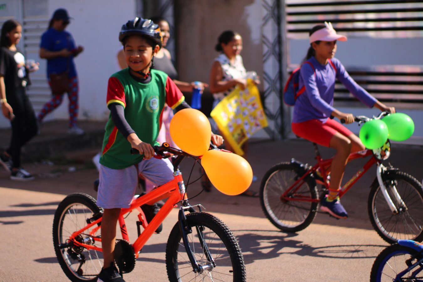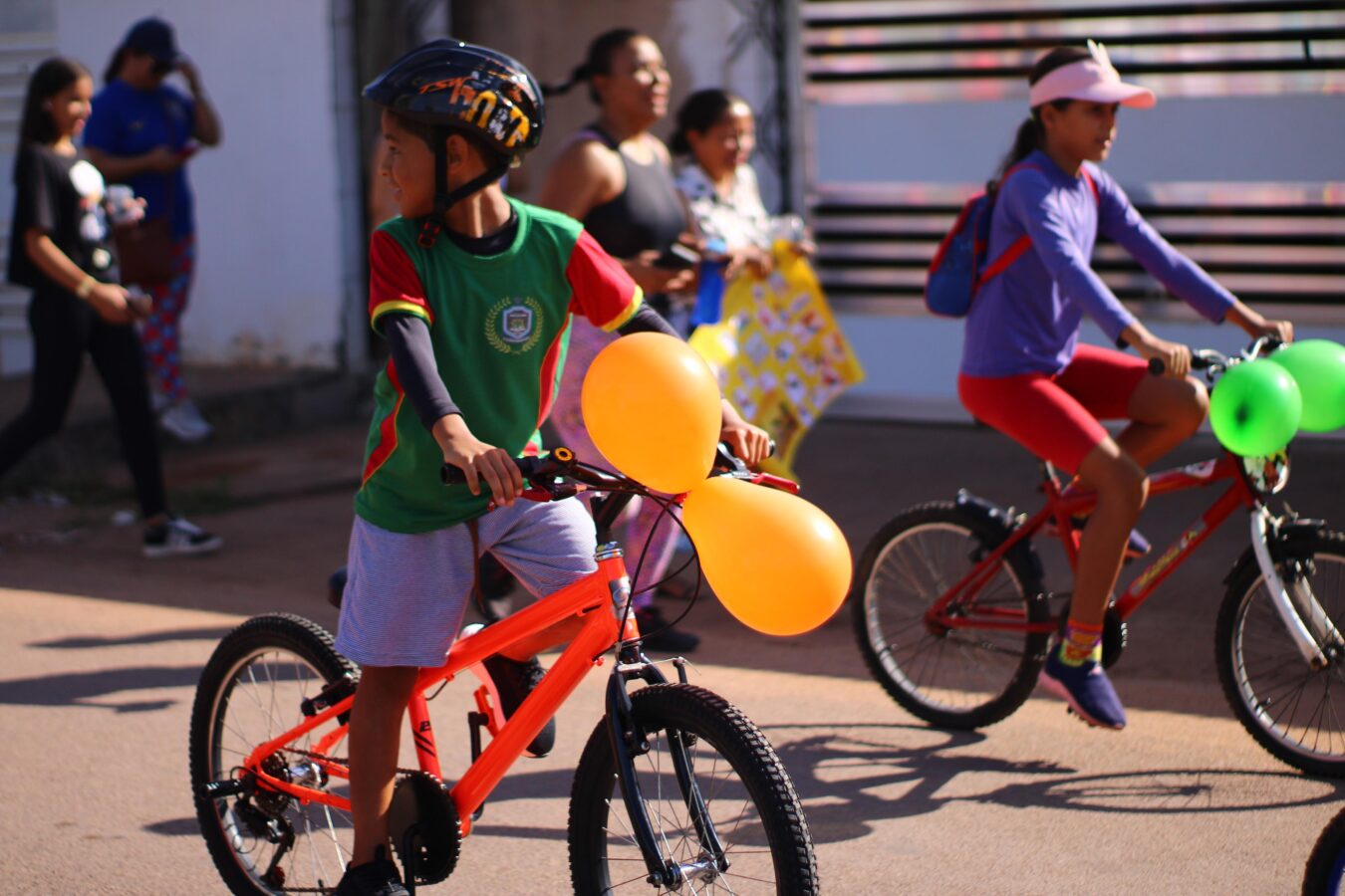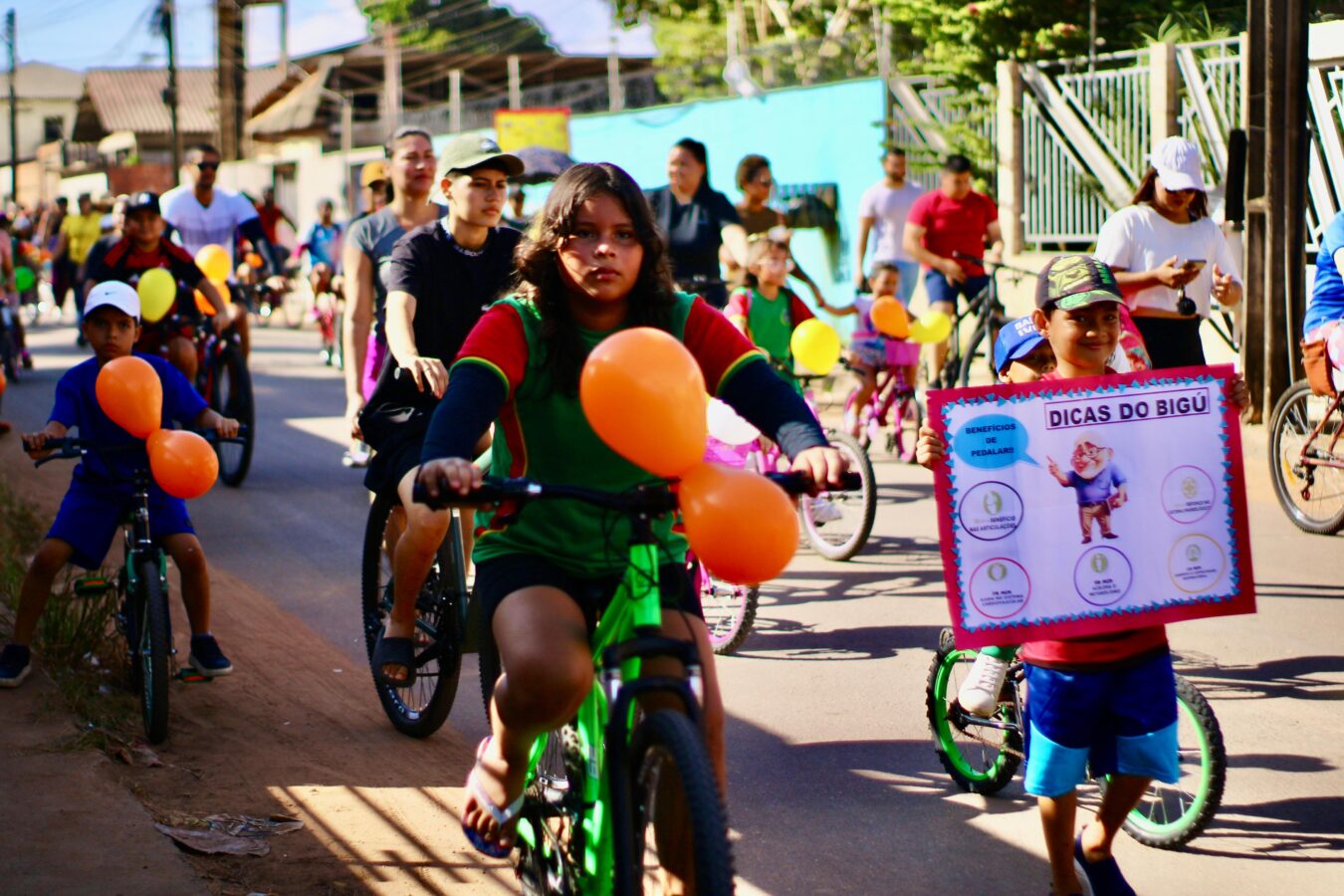 Pilotando sua bicicleta, o secretário municipal de Educação, Marcos Pantoja, destacou o momento como uma importante ação de lazer e promoção da saúde, realizada pela escola.