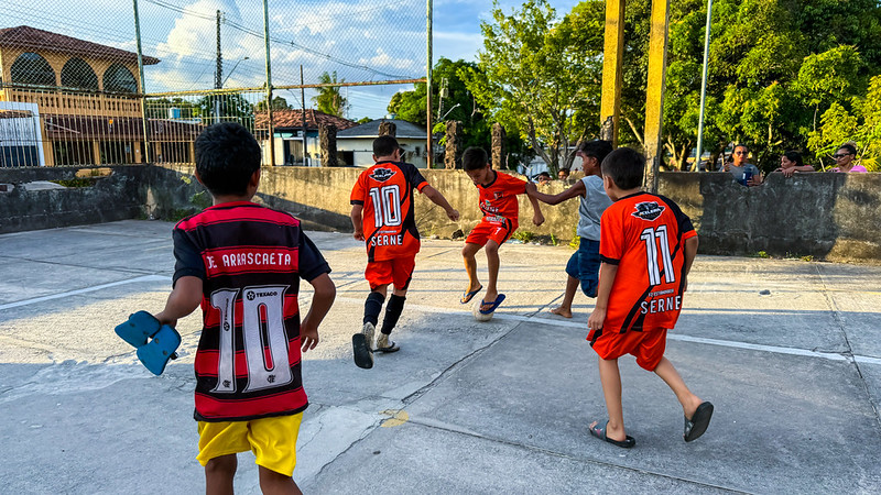 Crianças jogam futsal em uma quadra sem estrutura | Foto: Jesiel Braga/PMM