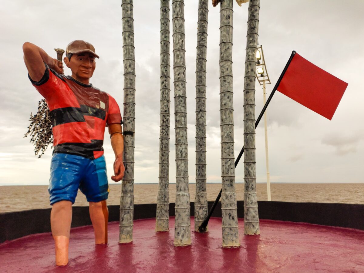 A escultura tem 10 metros de altura e 6 metros de circunferência. Ela retrata dois indígenas, representando o extrativismo milenar de nossos antepassados, além de dois ribeirinhos, representando o extrativismo comercial e familiar.