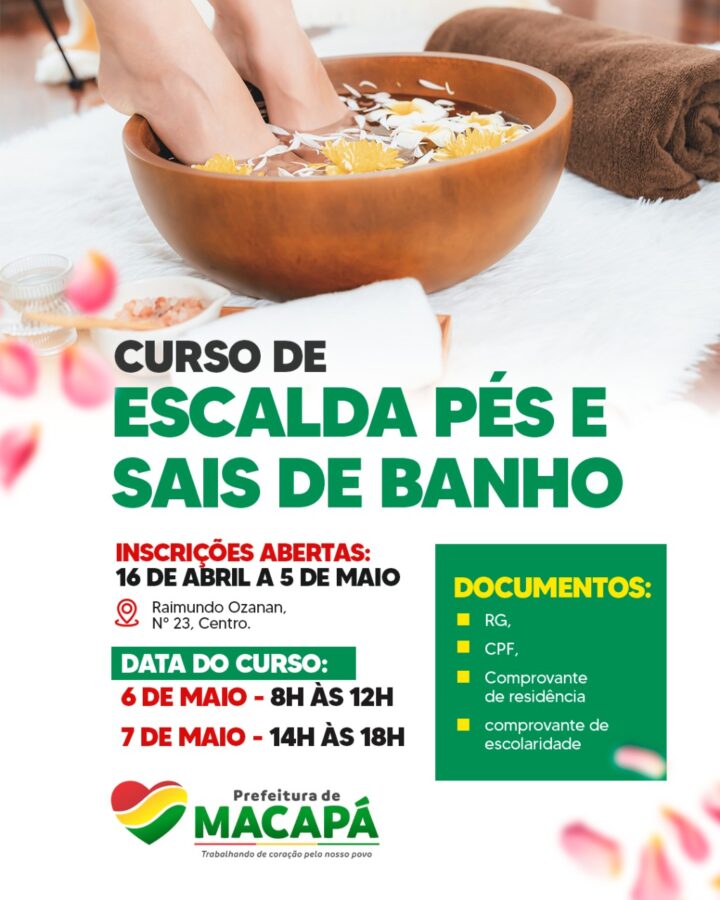 A Prefeitura de Macapá abre inscrições para um curso gratuito sobre escalda-pés e produção de sais de banho, que será realizado nos dias 6 e 7 de maio. As matrículas devem ser feitas presencialmente entre os dias 16 de abril e 5 de maio, no endereço Raimundo Ozana, nº 23. Para se inscrever, é necessário apresentar RG, CPF, comprovante de residência e de escolaridade.