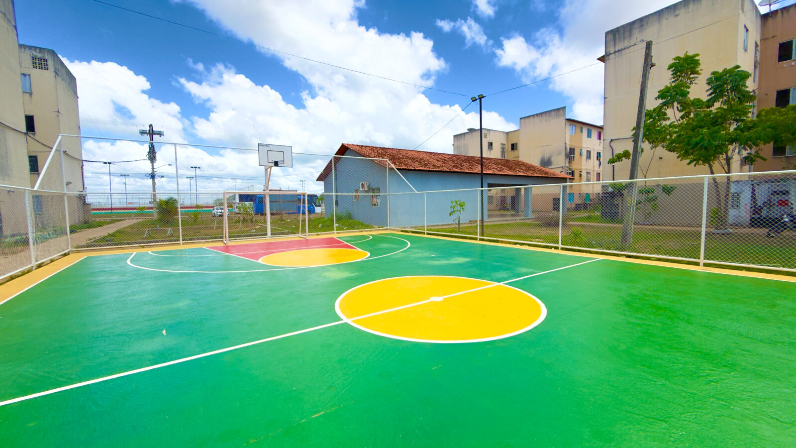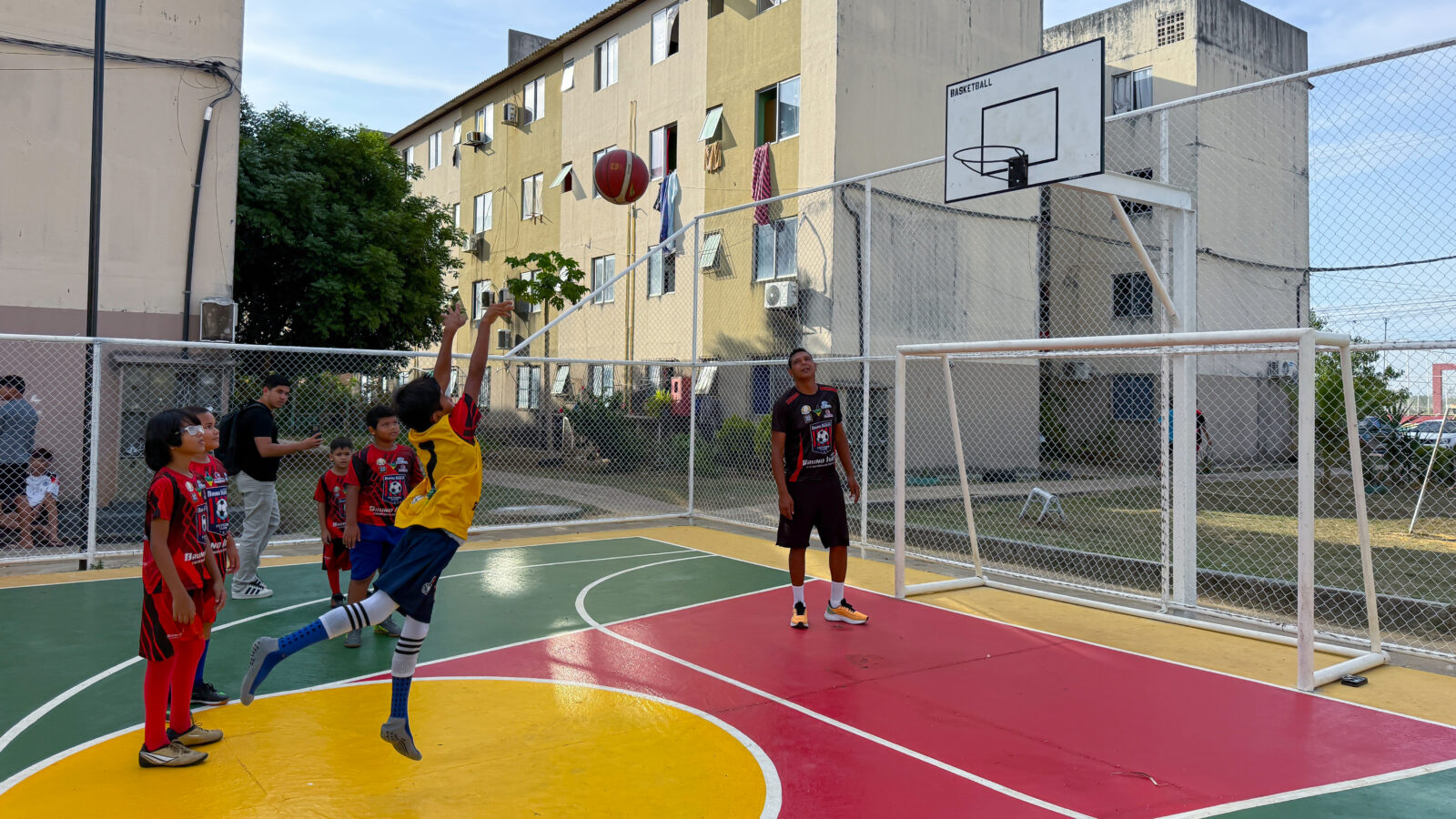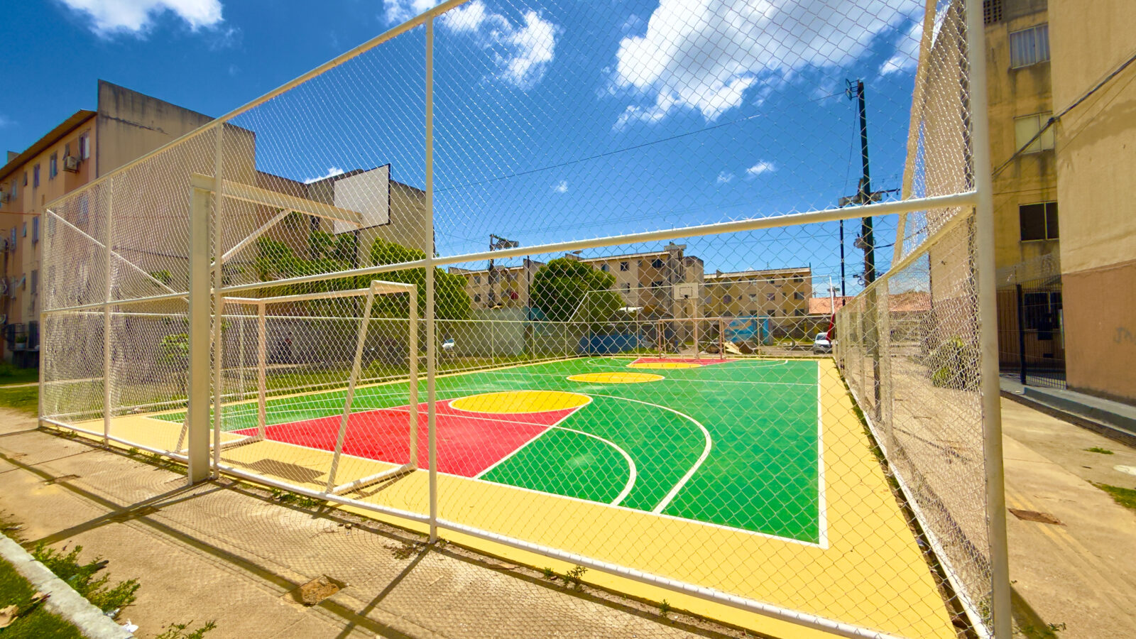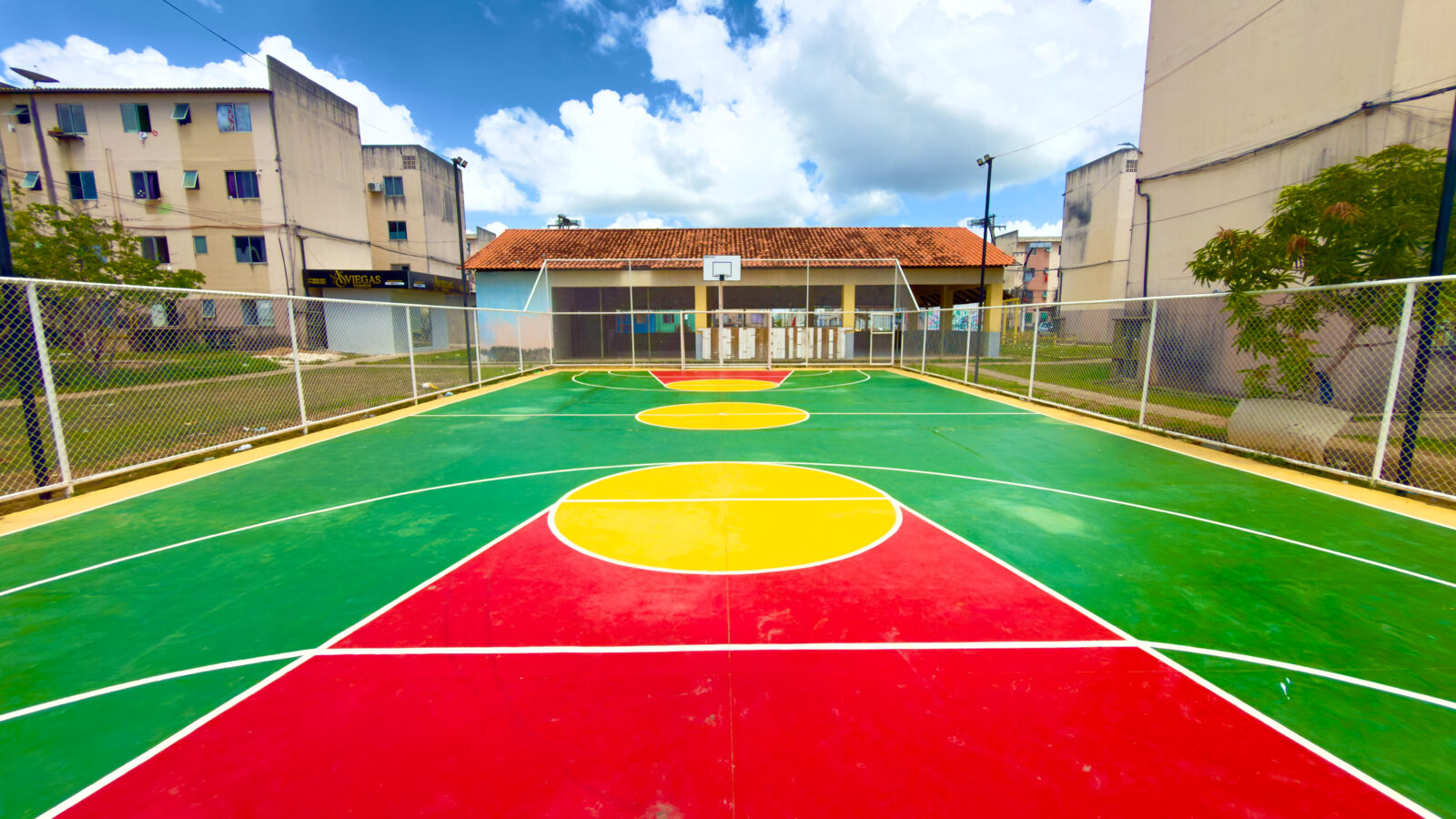 Entre os serviços executados estão a recuperação e pintura do piso, substituição dos alambrados, adequação do sistema de iluminação e instalação de novos equipamentos esportivos, como traves de futsal e estruturas oficiais para basquete.