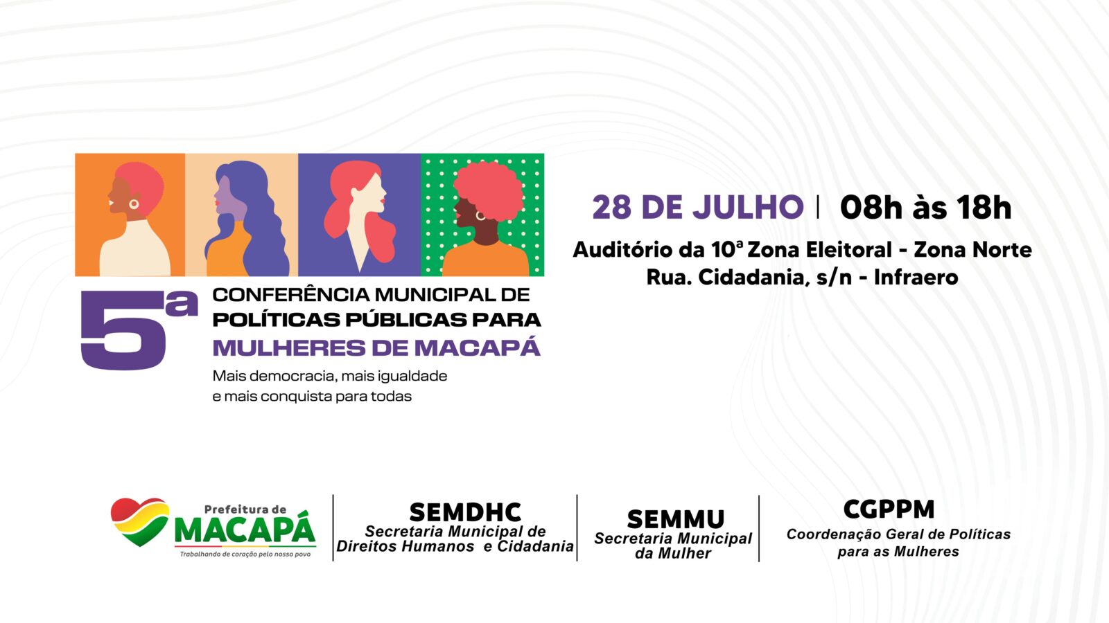 A Secretaria Municipal de Direitos Humanos e Cidadania (SEMDHC) e Secretaria Municipal da Mulher (Semmu), realizam na próxima segunda-feira, 28 de julho, a 5ª Conferência Municipal de Políticas Públicas para as Mulheres de Macapá. O evento ocorre das 8h às 18h, no auditório da 10ª Zona Eleitoral, na Rua Cidadania, S/N, no bairro Infraero, na Zona Norte da capital, com o tema “Mais democracia, mais igualdade e mais conquistas para todas”.