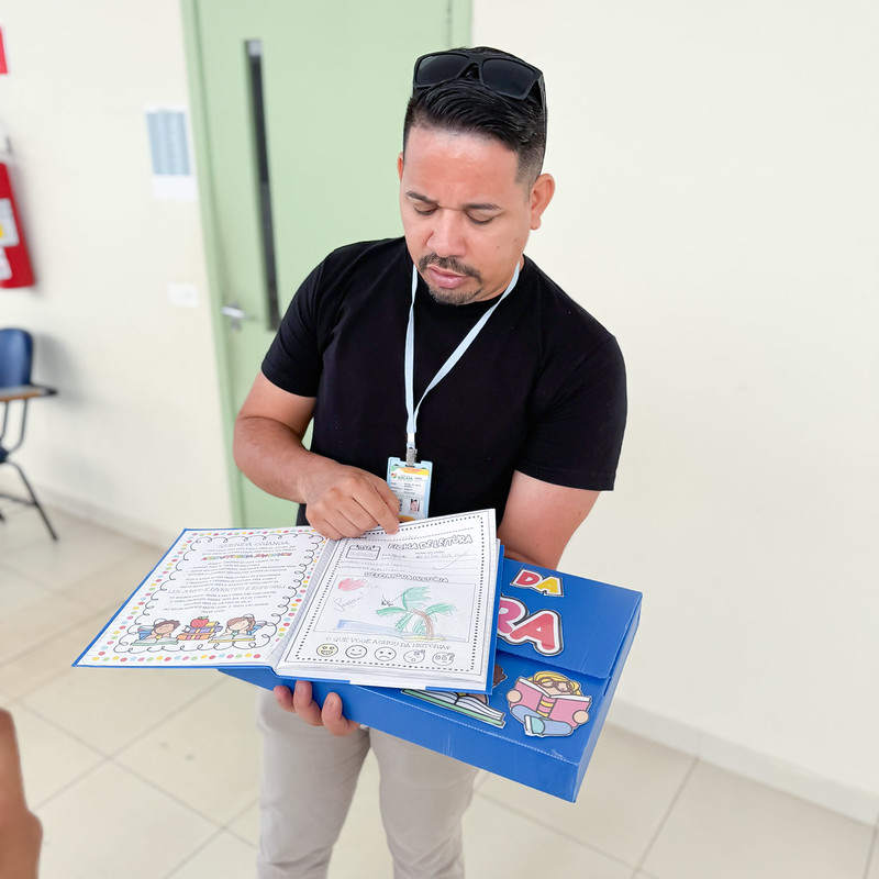 O professor Maciel Mendes, do 1º ano do Ensino Fundamental da Escola Municipal Elita Nunes, fez uma breve demonstração de seu projeto “Maleta da Leitura”, que estimula a criança a desenvolver sua leitura e escrita com a ajuda da família, uma vez que o material é levado para casa e as atividades são construídas em conjunto com os pais.