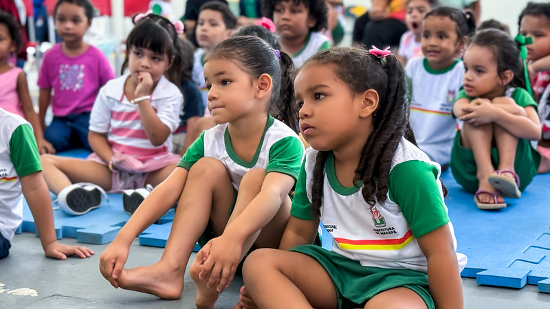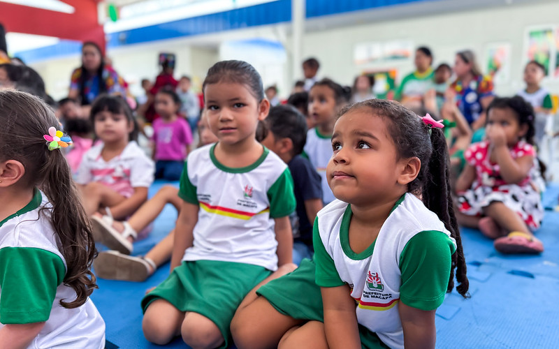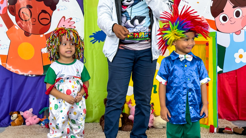 As pequenas Maria Alice e Nayra Viana, ambas com 3 anos, estavam atentas às atividades e brincadeiras apresentadas pelo Tio Nescal, junto das outras crianças, que cantaram, dançaram e fizeram a maior festa no pátio da creche.