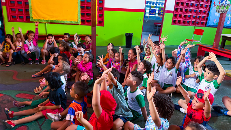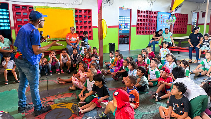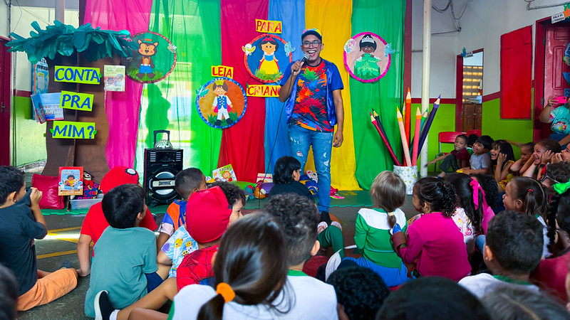 A ação é coordenada pelo contador de histórias Fábio Nescal (Tio Nescal), que foi recebido com entusiasmo e animação pelos alunos da escola.