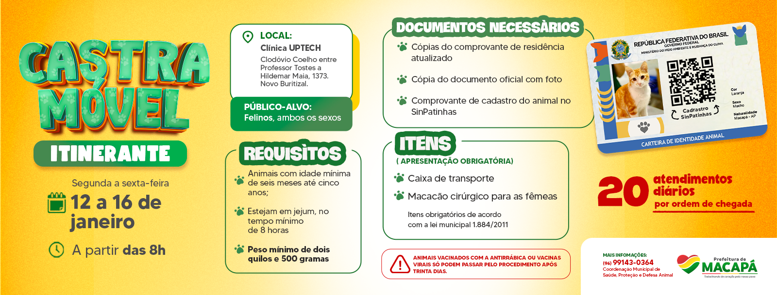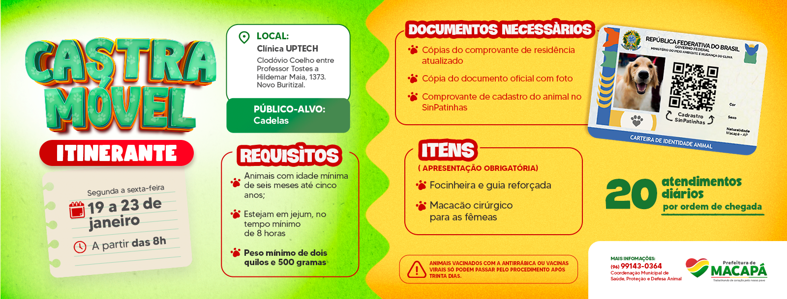 O Castramóvel realiza, de 26 a 30 de janeiro, castração gratuita para cães machos em Macapá. Serão ofertados 20 atendimentos diários, de segunda a sexta-feira, das 8h às 18h, com as cirurgias realizadas no período da tarde. Os procedimentos ocorrerão na Clínica Uptech, localizada na Rua Clodóvio Coelho, esquina com a Avenida Hildemar Maia, nº …