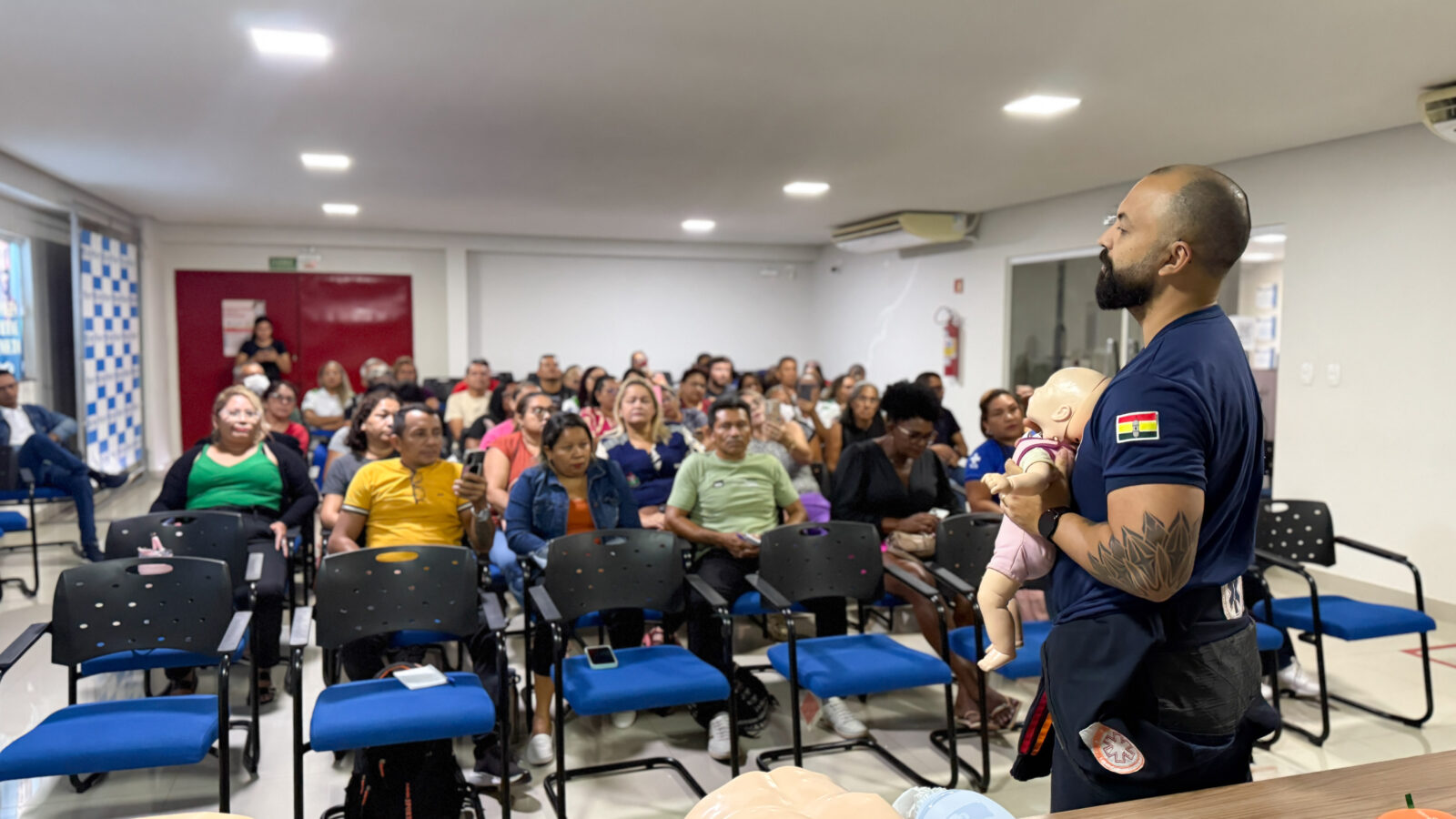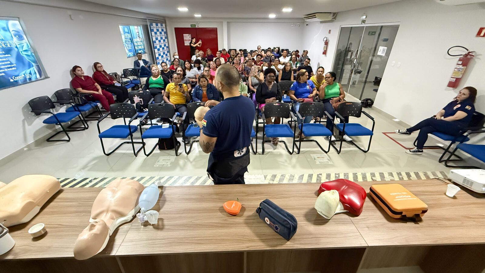 A formação reuniu cerca de 100 agentes e abordou temas como reconhecimento de sinais vitais, desobstrução de vias aéreas, técnicas de reanimação cardiopulmonar (RCP) e uso de equipamentos básicos de suporte.